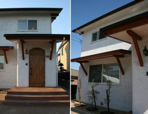 軒天は杉板あらわしで、フランス瓦に塗り壁の外観はまるで