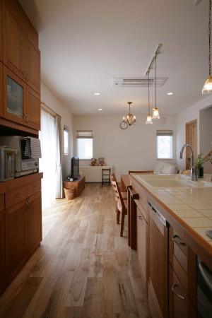 上質な造り付けのオーダーキッチンや淡い色合いのメープルの床材、優しく光りを反射させる珪藻土の壁などとても心地よい空間です