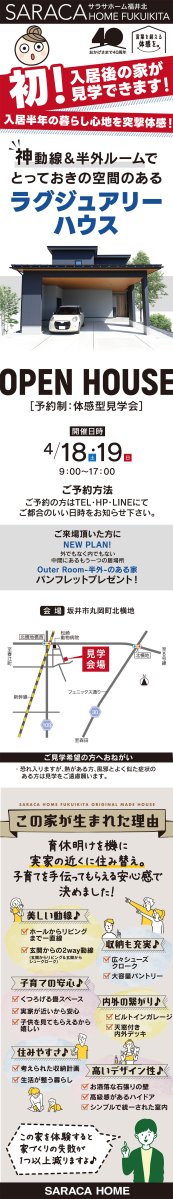 4/18(土)・19(日)坂井市丸岡町で、神動線&半外ルームでとっておきの空間のあるラグジュアリーハウスの予約制体感型見学会を開催致します。