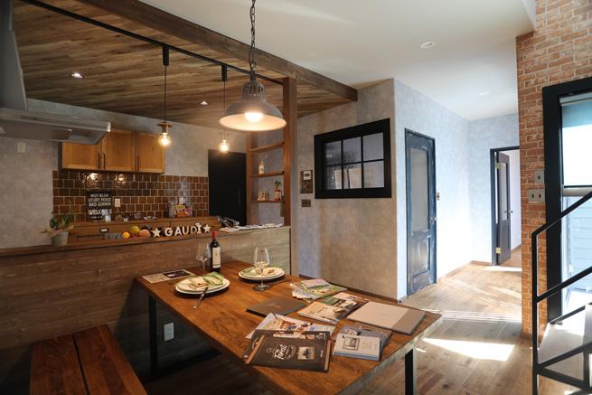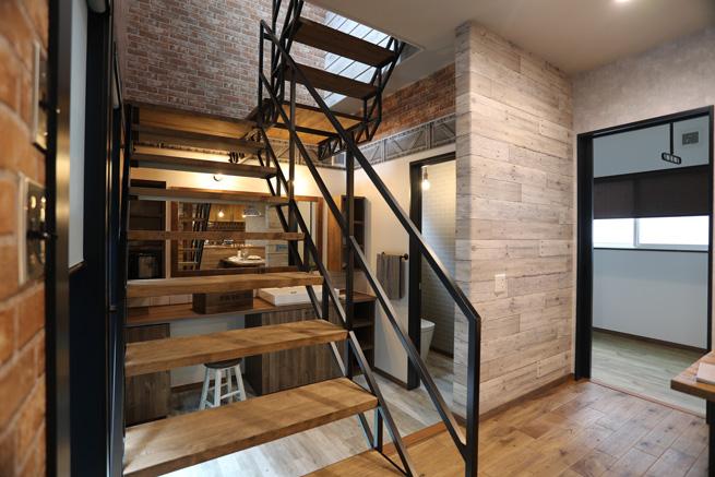 無骨なトラス階段とブリックタイルの壁がかっこいいブルックリンスタイルのお家。
