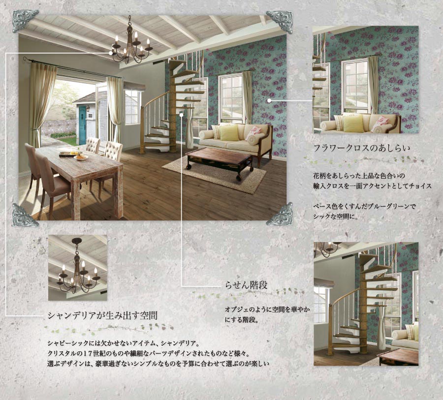 シャビーシックには欠かせない アイテム、シャンデリア。 クリスタルの17世紀のものや 繊細なパーツデザインされたも のなど様々。選ぶデザインは、 豪華過ぎないシンプルなものを 予算に合わせて選ぶのが楽しい